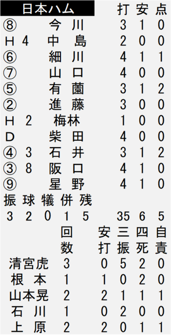 二回、4番の有薗直輝内野手(21)が先制の6号ソロを叩き込むと、7番の石井一成内野手(30)も1号2ランで続いた。3-0の五回には無死一、三塁で2番の細川凌平内野手(22)が適時二塁打を放った。さらに1死二、三塁と攻め立て、有薗の遊ゴロの間に1点を加えた。