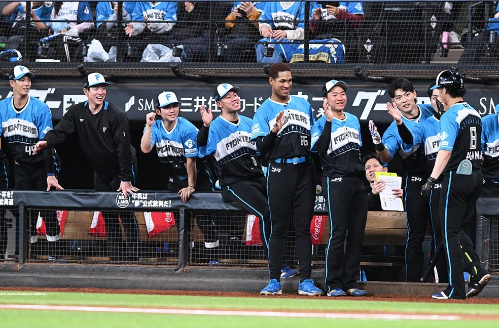 一回、先頭打者弾を放った浅間(手前右)を迎える日本ハムナイン