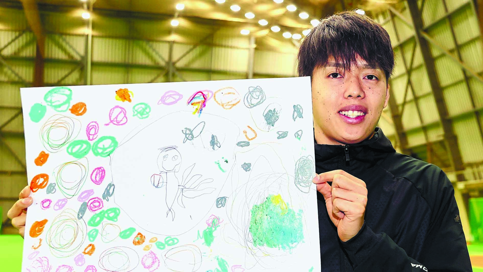 今回の企画に合わせ、杉浦の愛する子供たちが貴重なスケッチを提供してくれた。画用紙に新球場と、そこでプレーする父の姿が描かれていた。周辺の施設や自然も色彩豊かに表現。4歳の長女と2歳の長男による合作だった。杉浦は「画像(完成イメージ)を見せたら、何も言わずに描き始めました。上手ですかね?」と、優しいパパの顔を見せていた。