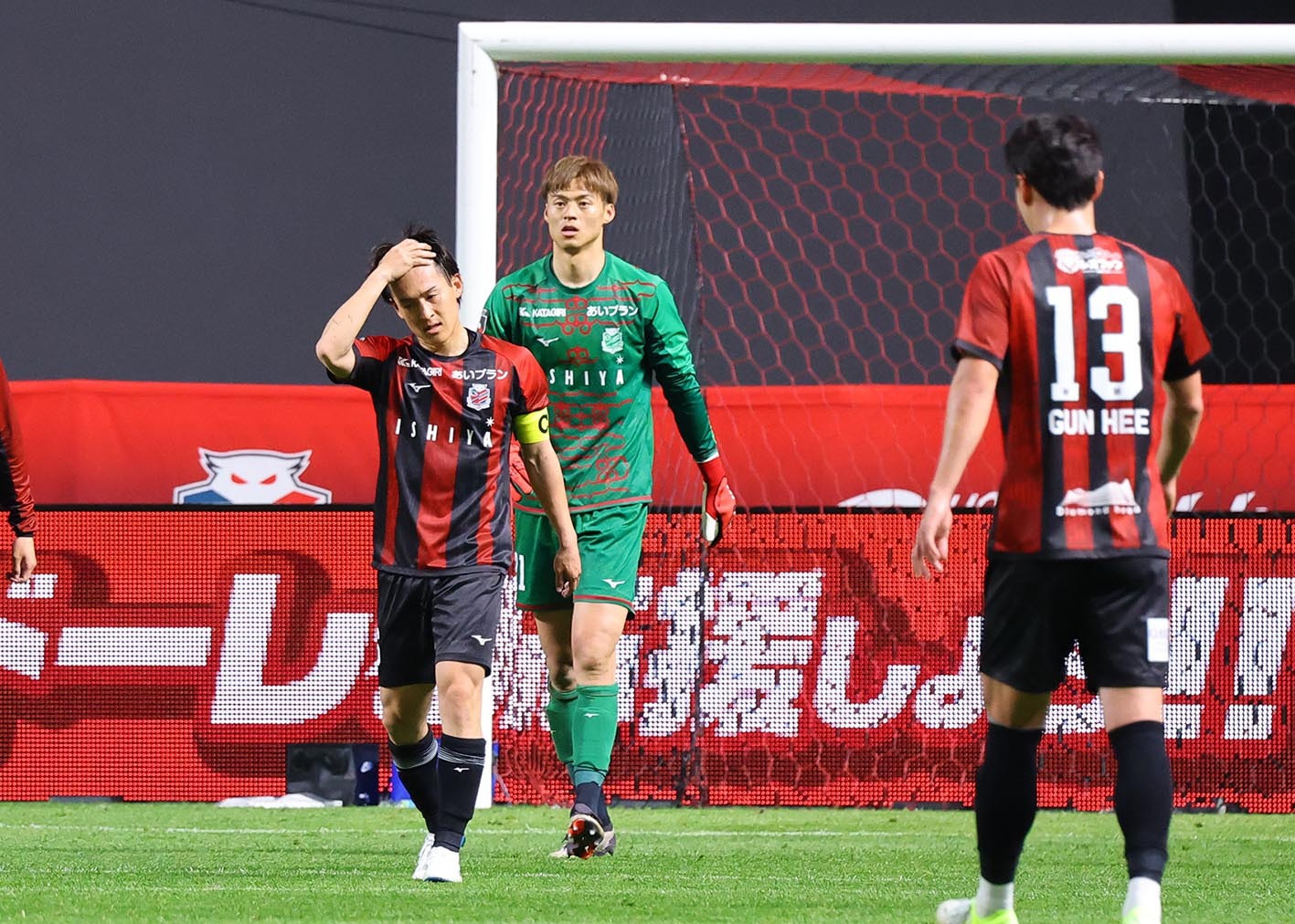 前半20分、オウンゴールで2点目を奪われて肩を落とす札幌の選手たち=撮影・松本奈央