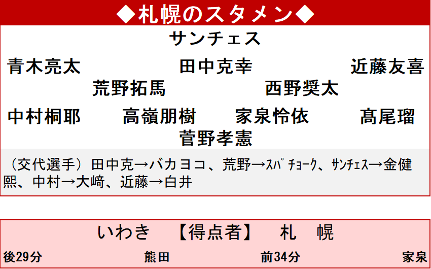 北海道コンサドーレ札幌はいわきFCとアウェー対戦し、1-1で引き分けた。ゴールデンウイークの連戦から中4日で敵地に乗り込んだ札幌は、フィジカルに長け、直近5戦負け無しと好調ないわきに対し、MF田中克幸(23)を1.5列目のトップ下に置く、4-5-1で臨んだ。
