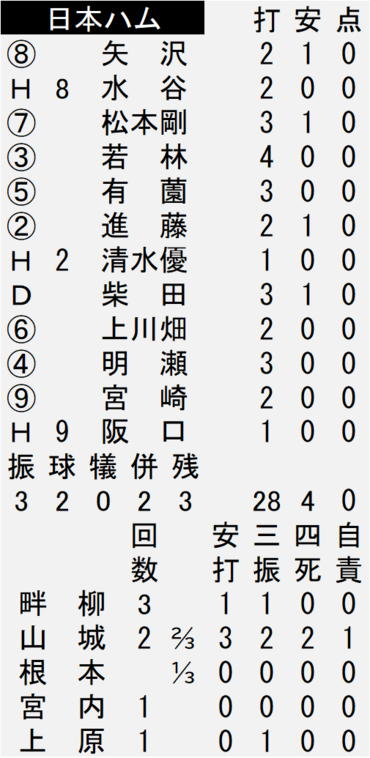 打線は楽天3投手の継投の前に、散発4安打に抑え込まれて得点を奪えず。両チーム4安打ずつだったが、バッテリーミスが出た分、明暗が分かれた。