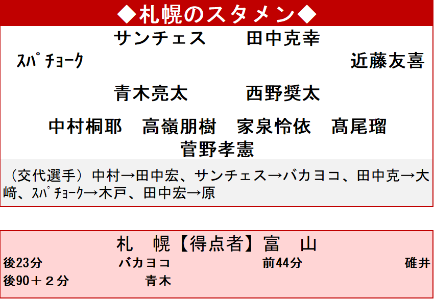 なんとしても決勝点が欲しい札幌は、後半38分に3枚替えした。前半38分から途中出場していた田中宏に代え、投入したMF原康介(19)が、キーマンになった。後半45分、ペナルティーエリア手前で原が倒されてFKを獲得。キッカーのMF青木亮太(29)が、ほぼ助走なく右足で蹴ったFKは美しい弧を描きゴール左上に吸い込まれた。富山GK平尾も動けず、見送るしかなかった。後半アディショナルタイム2分に奪った勝ち越しゴール。3試合ぶりの勝利で、勝ち点を「20」に伸ばした。