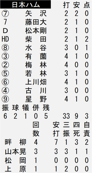 打線は四回に併殺打の間に1点を返し、六回には無死一、二塁から二刀流ルーキーの柴田獅子投手(19)が代打で適時三塁打。続く水谷瞬外野手(24)が犠牲フライで柴田を生還させた。