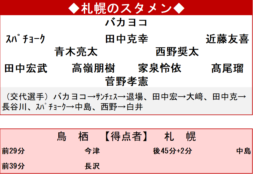 その後も猛攻を続けた札幌だったが、鳥栖の手堅い守備に守り切られて試合終了。今季2度目の連勝とはならず、敵地での勝ち点も奪えなかったが、順位は12位のまま変わらなかった。