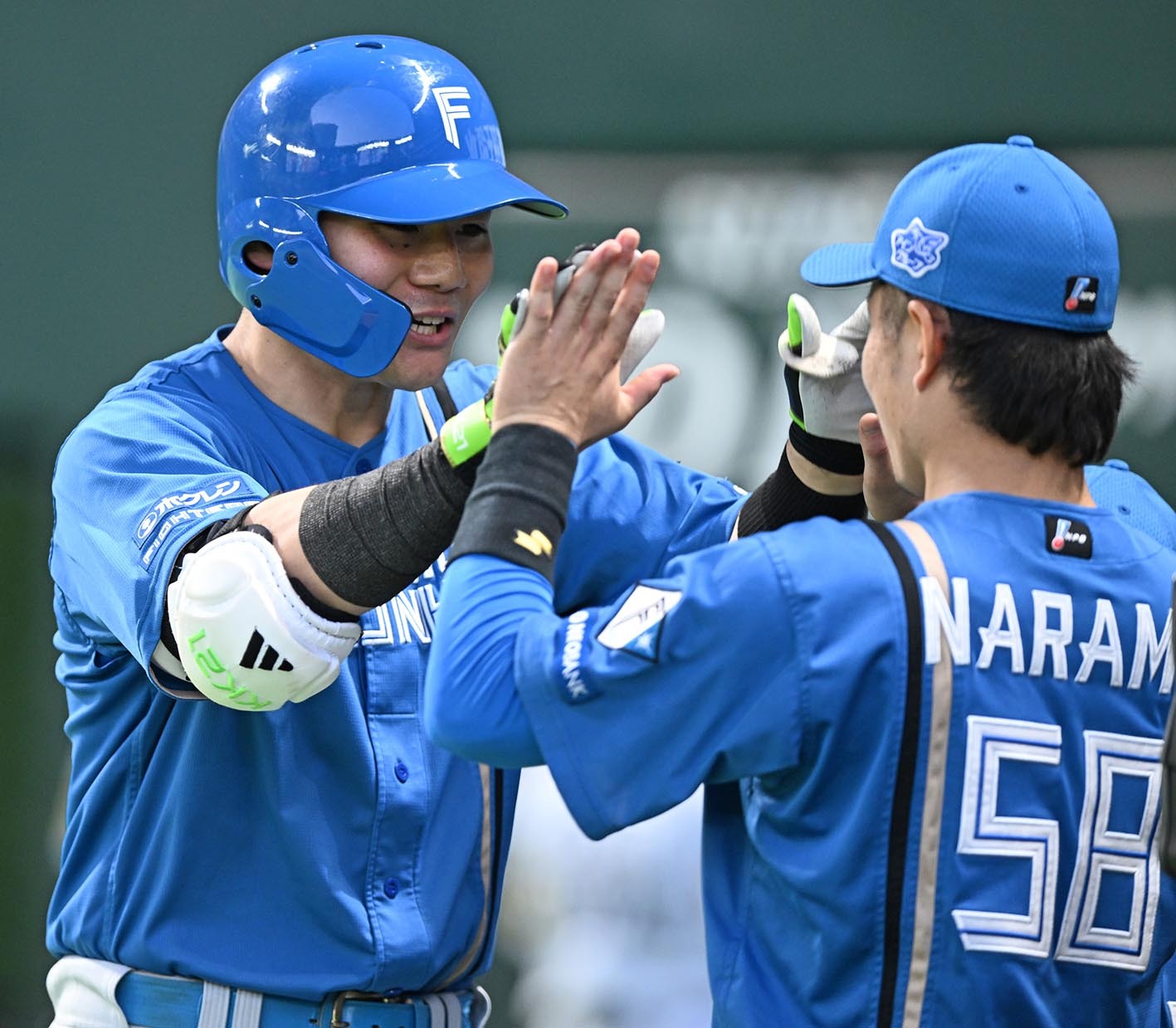 「ボス(新庄監督)にも『タイミングをもうちょい早く取ろうか』と、(本塁打を放った)打席前に言われて。宮さん(宮西)にも『インコースを待っておけ』と言われていて、いろいろなアドバイスが集約された1本だったなと思います」。新旧のチームメートたちからの教えが生み出したホームランだった。