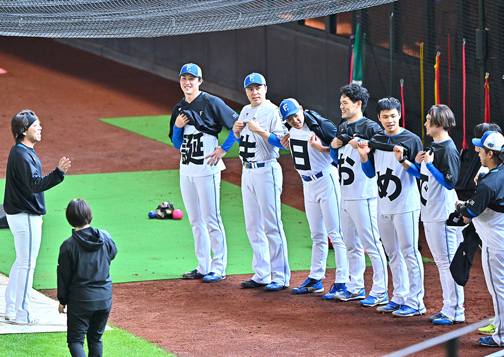 日本ハムのリリーフ陣が、2日に40歳の誕生日を迎える宮西尚生投手へ〝バースデーサプライズ〟を決行した。エスコンフィールド北海道で行われた1日のロッテ戦前に、「誕生日おめでとう!」と1文字ずつ書かれたTシャツを着て祝福した。