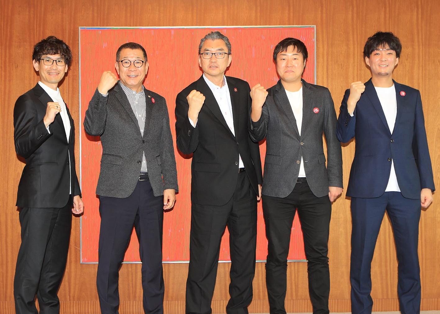 札幌市役所の加藤副市長(中央)を表敬訪問したSVリーグの大河チェアマン(左から2人目)、イエスタの澤野代表(左端)、アルテミス北海道の山崎新オーナー(同4人目)=撮影・西川薫