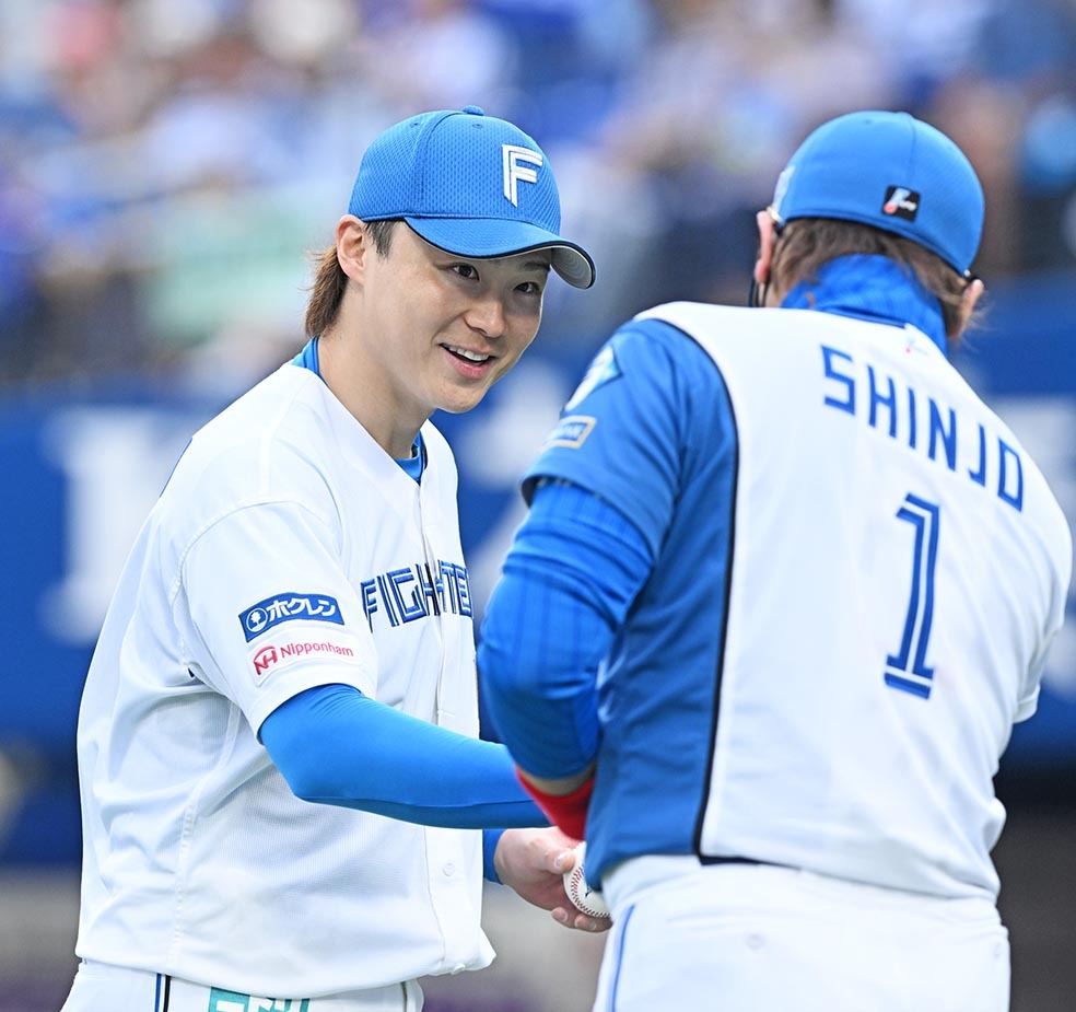 試合終了後、新庄監督(右)とタッチを交わす山崎