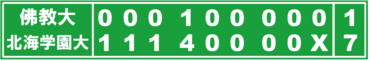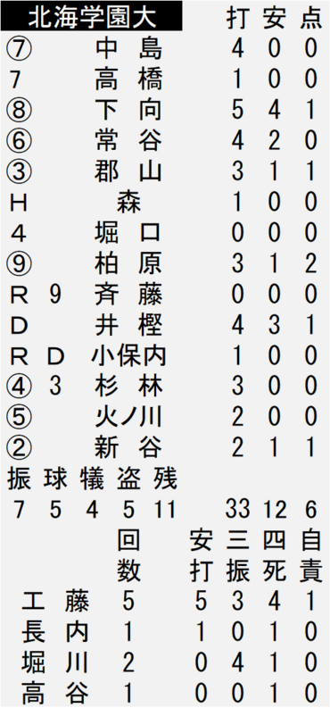 その裏の北海学園大は、相手失策で出塁し、盗塁と犠打で2死三塁まで好機を広げ、続く下向の適時打と、2死一、三塁から相手投手のけん制悪送球の間に三走が生還。さらに死球を挟んで、柏原の2点打で一挙4得点。大きく引き離した。