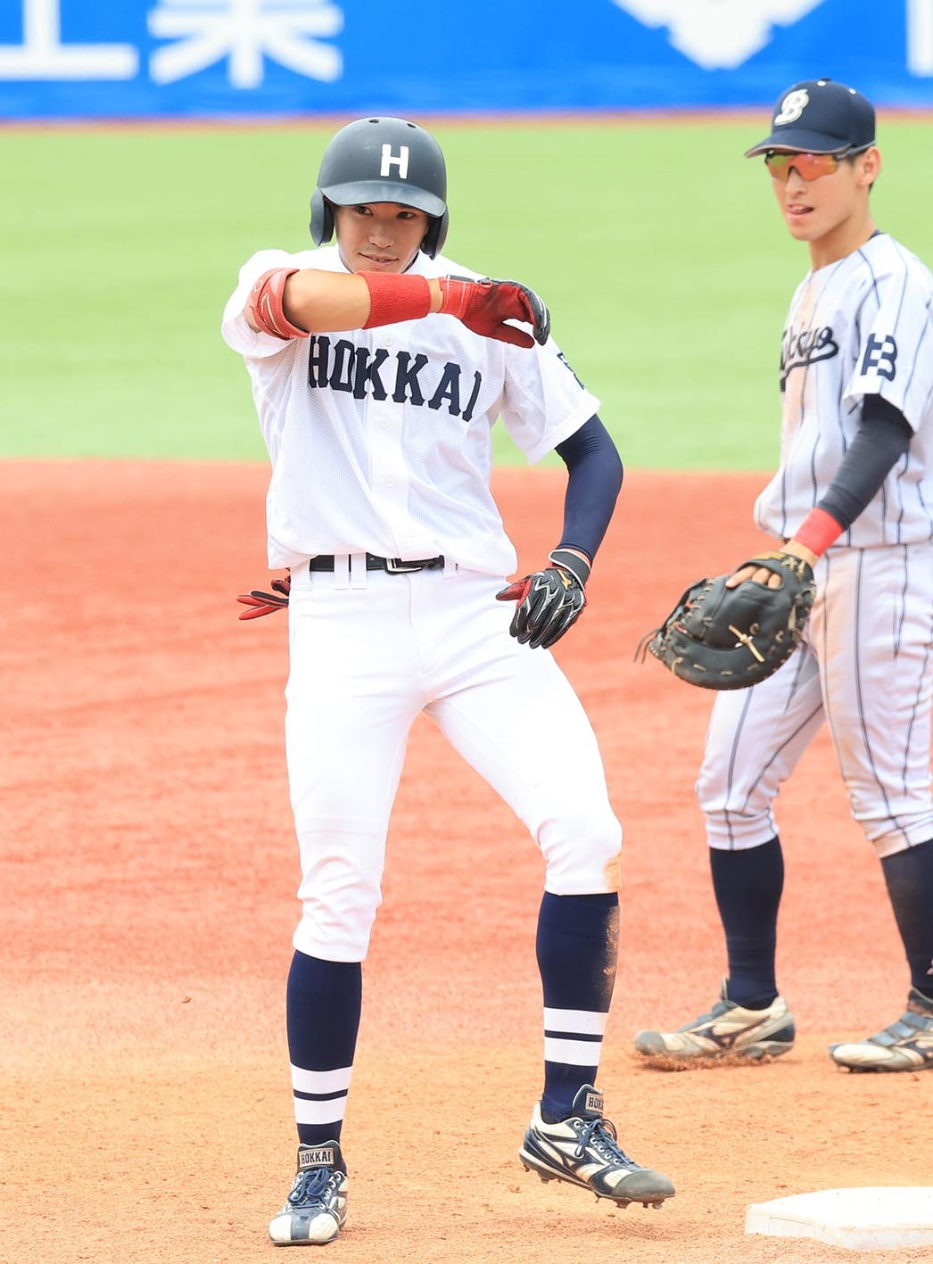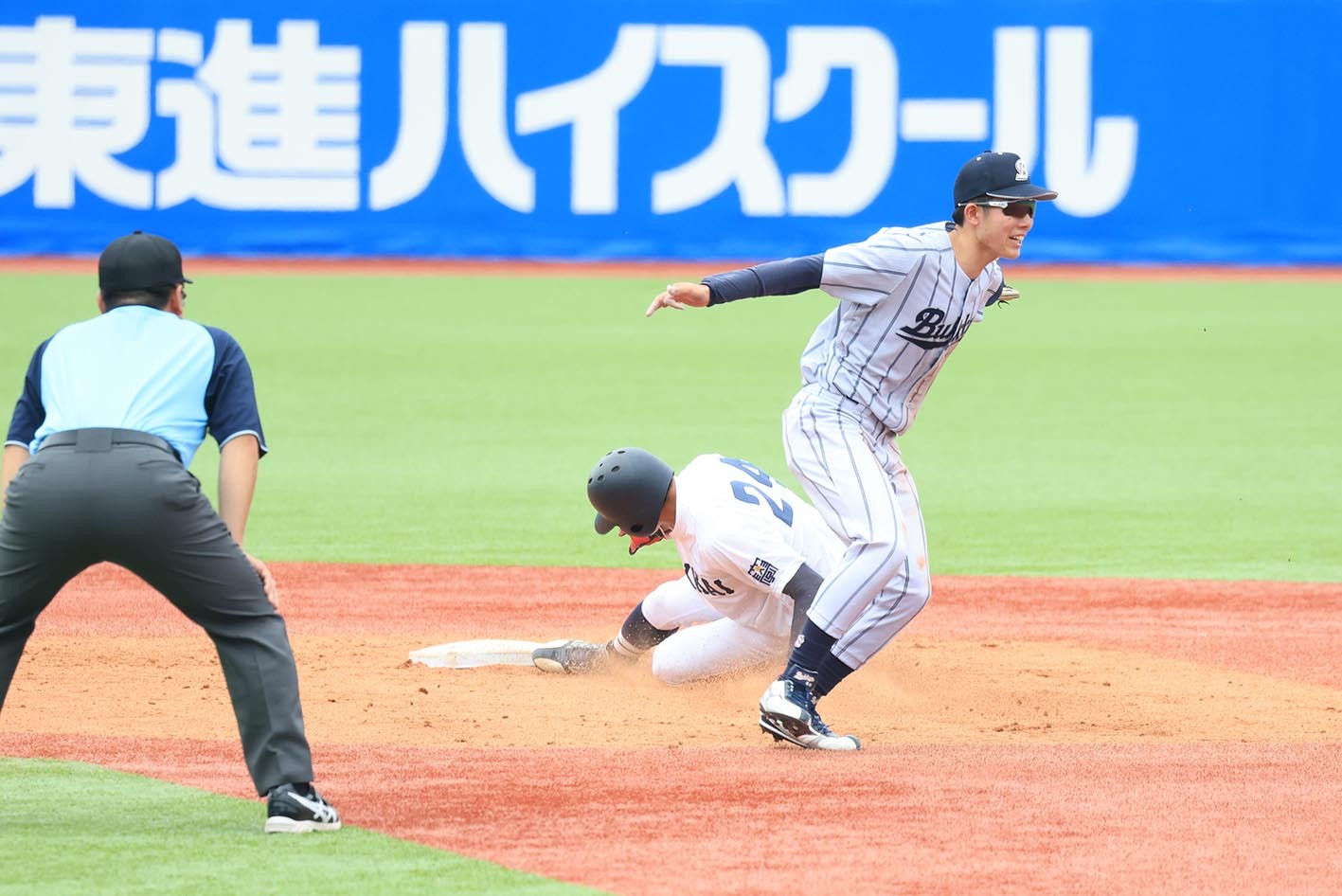 1試合3盗塁は、大会記録まであと「1」。50メートルは6秒ジャスト。データ班が1回戦で相手投手陣を研究。「癖があるのを聞いていて、それを意識してやっていたら、本当にその癖があった。それでスタートを切れました」。春季リーグでは10試合で3盗塁だったが、この試合で一気に3度成功。そのうち2度は本塁生還につなげた。