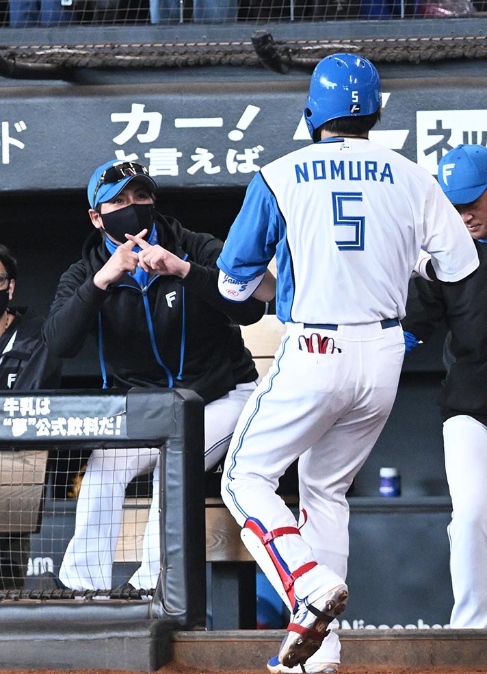 七回終了後、適時三塁打を放った野村(左)に声を掛ける新庄監督(右)