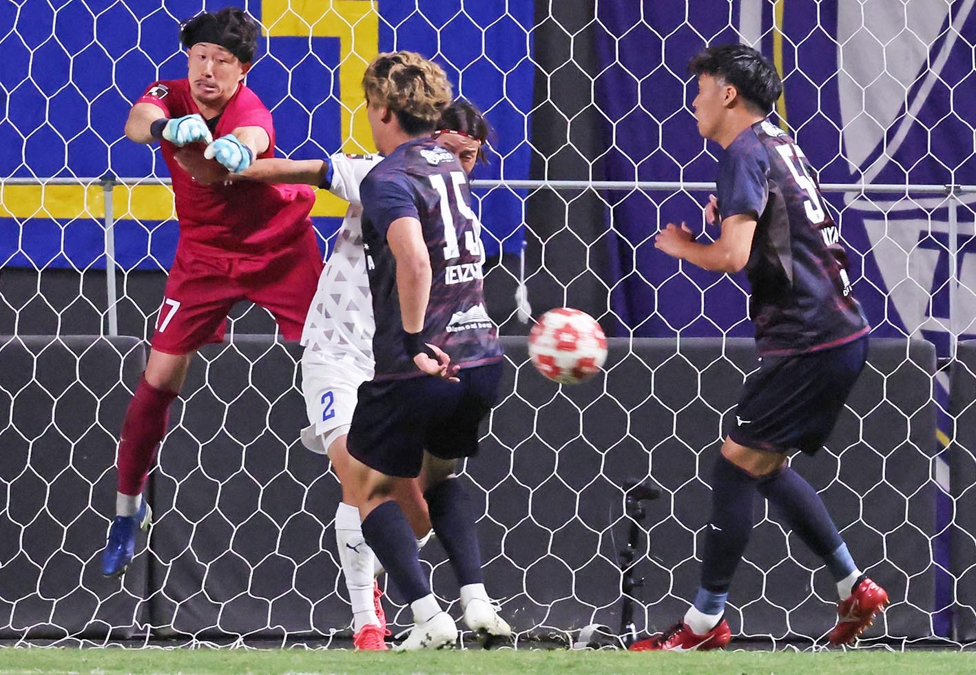 前半、相手のCKをクリアするDF家泉(中央)=撮影・小田岳史