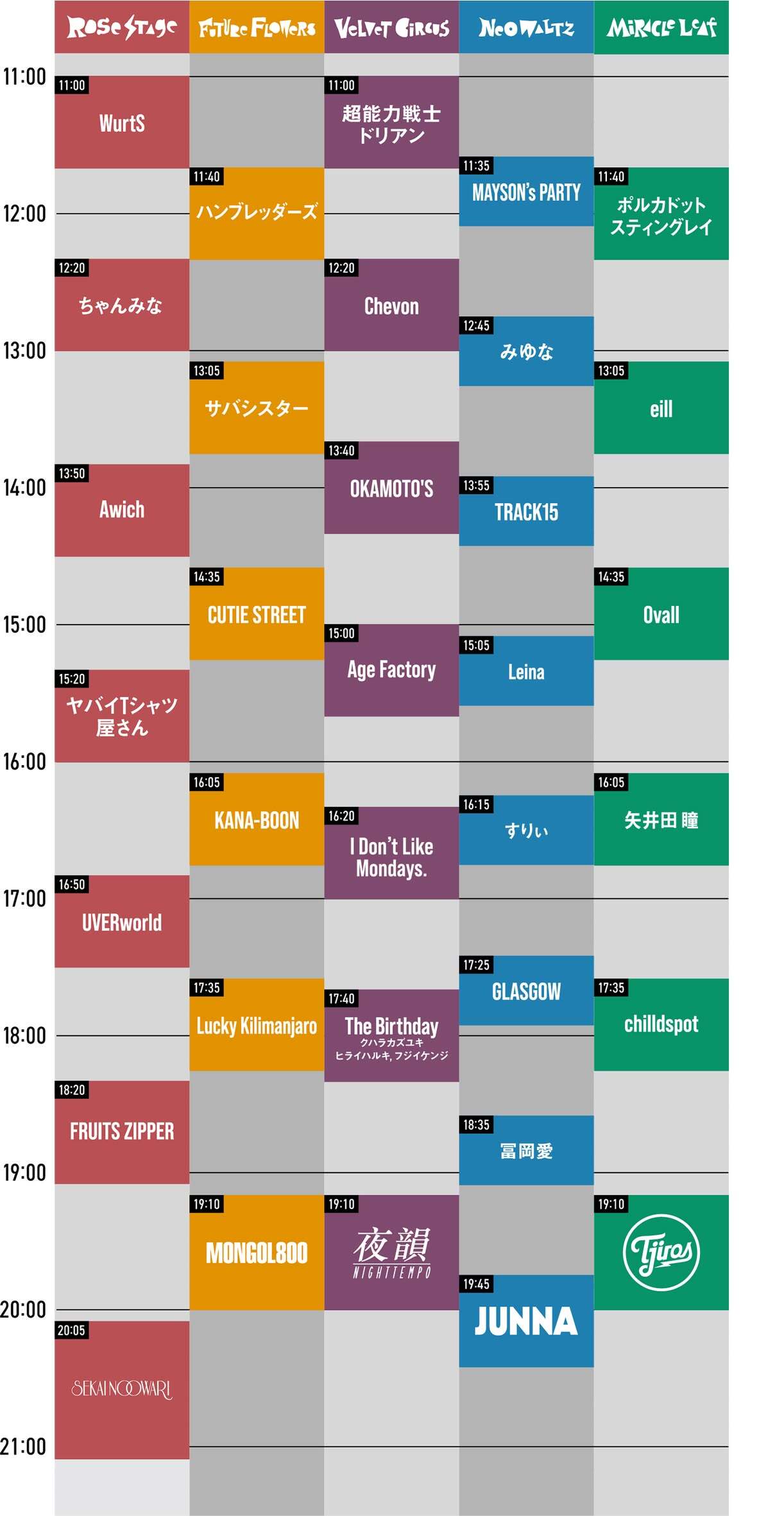 I Don't Like Mondays. / UVERworld / Age Factory / eill / Awich / Ovall / OKAMOTO'S / KANA-BOON / CUTIE STREET / GLASGOW / サバシスター / Chevon / JUNNA / すりぃ / SEKAI NO OWARI / ちゃんみな / 超能力戦士ドリアン / chilldspot / T字路s / 冨岡愛 / TRACK15 / Night Tempo / The Birthday(クハラカズユキ, ヒライハルキ, フジイケンジ) / ハンブレッダーズ / FRUITS ZIPPER / ポルカドットスティングレイ / みゆな / MAYSON's PARTY / MONGOL800 / 矢井田 瞳 / ヤバイTシャツ屋さん / Lucky Kilimanjaro / Leina / WurtS