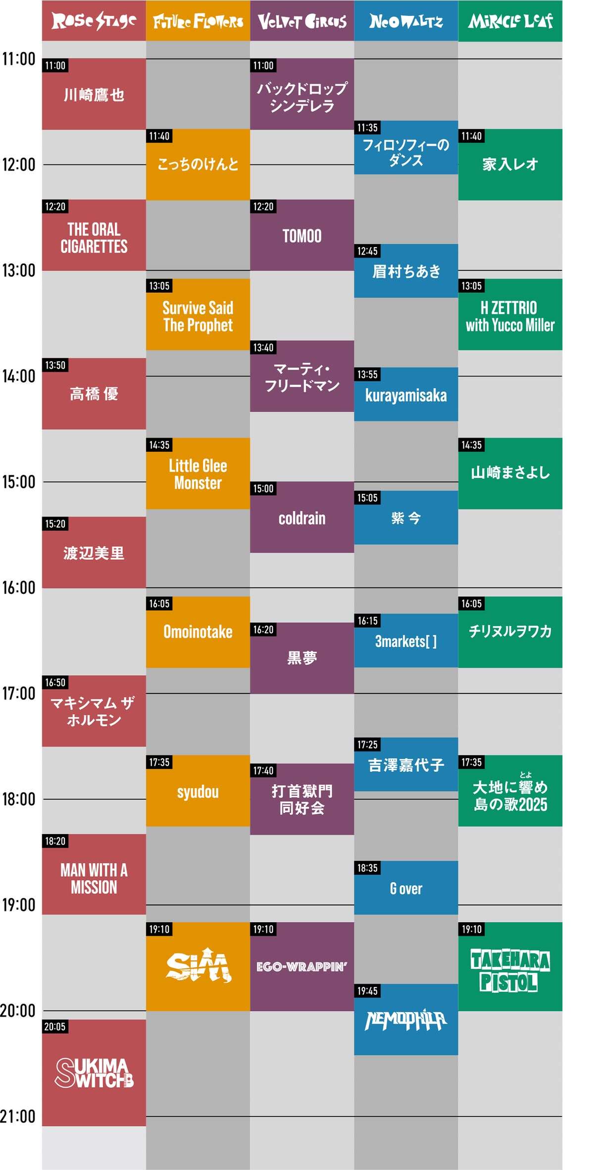 家入レオ / 打首獄門同好会 / H ZETTRIO with Yucco Miller / EGO-WRAPPIN' / THE ORAL CIGARETTES / Omoinotake / 川崎鷹也 / kurayamisaka / 黒夢 / coldrain / こっちのけんと / Survive Said The Prophet / G over / SiM / syudou / スキマスイッチ / 3markets[ ] / 大地に響め島の歌 2025 / 高橋 優 / 竹原ピストル / チリヌルヲワカ / TOMOO / NEMOPHILA / バックドロップシンデレラ / フィロソフィーのダンス / マーティ・フリードマン / マキシマム ザ ホルモン / 眉村ちあき / MAN WITH A MISSION / 紫 今 / 山崎まさよし / 吉澤嘉代子 / Little Glee Monster / 渡辺美里