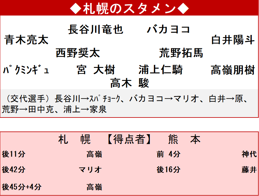 戦前まで9戦勝ちなしと低迷している17位の熊本と対戦。札幌は左利きの道産子MF高嶺朋樹主将(27)を初めて右サイドバックで起用して臨んだ。右足でクロスを上げるなど縦への突破はなかったが、ビルドアップや対人の強さなどの長所を生かしながらプレーし、後半には強烈ミドルでの一時同点ゴール、勝ち越しゴールと2得点を挙げて勝利に貢献した。