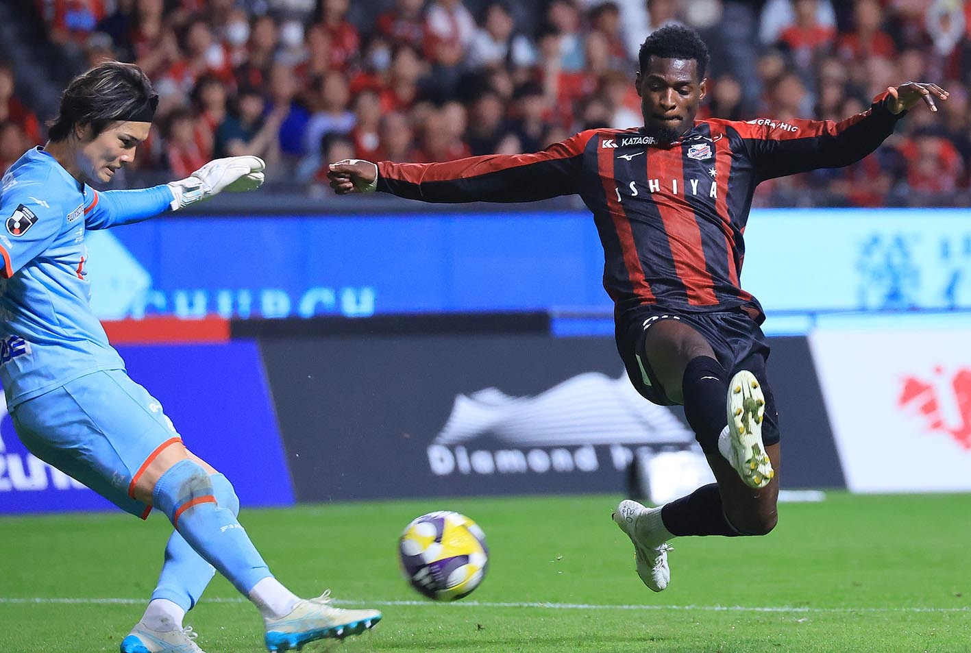 前半45分、MF高嶺(右)のシュートコースを変えてゴールを決めるFWバカヨコ(左)=撮影・北波智史