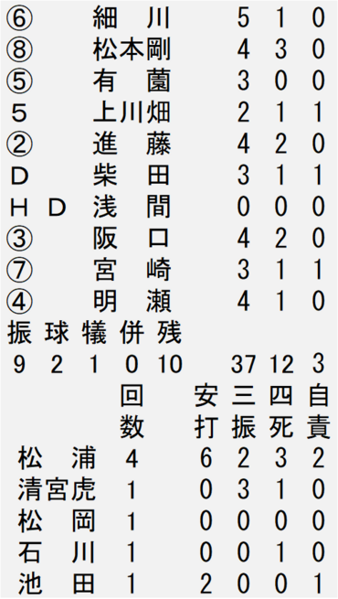 三回以降は互いに得点できずスコアボードに0が続いたが、八回に試合が動いた。無死二塁、途中出場の上川畑大悟内野手(28)の適時二塁打で1点差に詰め寄る。1死満塁となり、8番・宮崎一樹外野手(23)の犠飛で再び同点に追いついた。