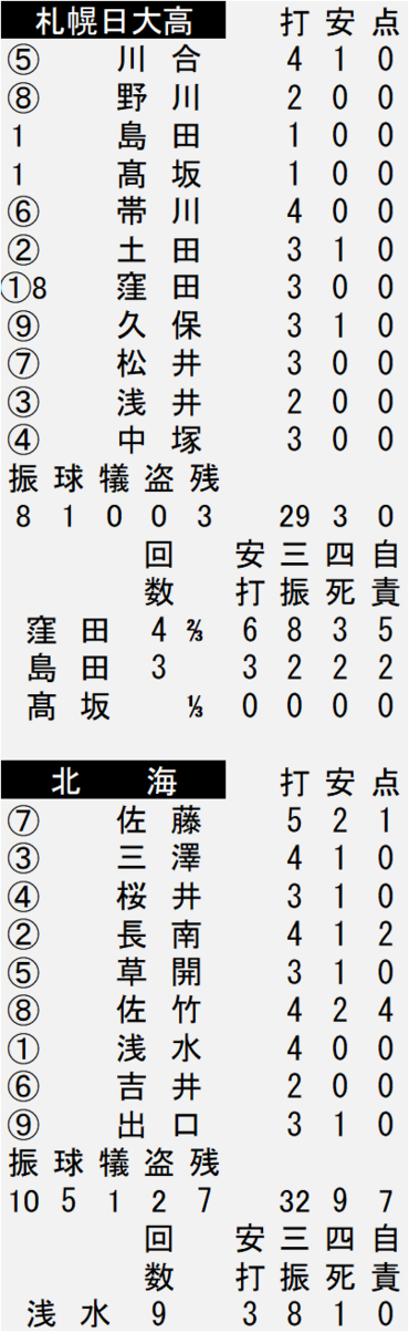 なんとか反撃したかった札幌日大高打線だったが、浅水のプレートを目一杯使った角度のあるボールを最後まで打ちあぐみ、九回までで3安打。二塁まで走者を進めることできず、2連覇の夢を果たすことができなかった。