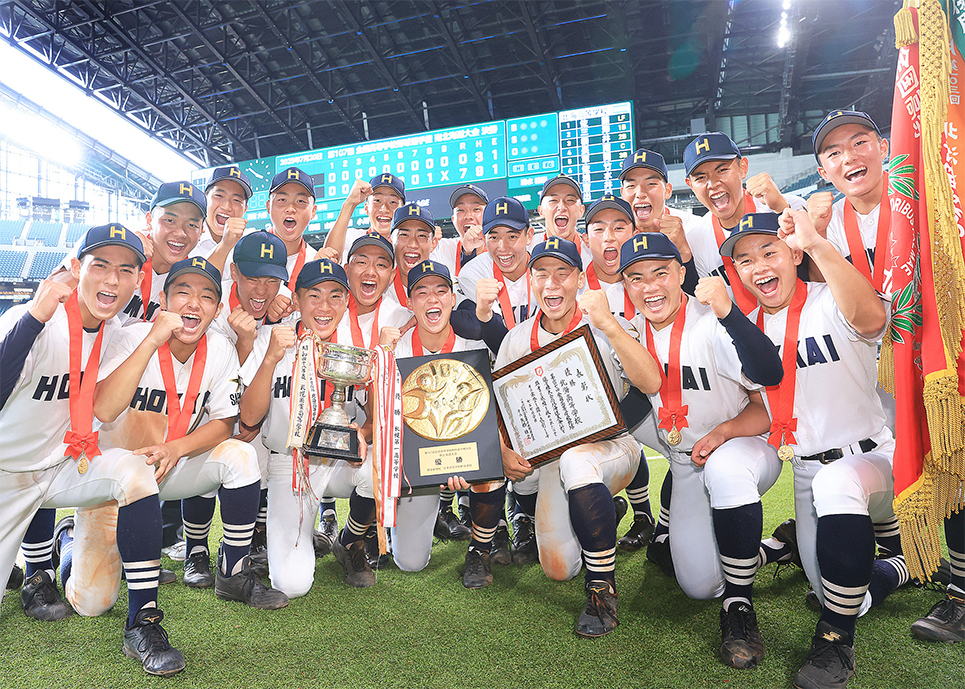 最後に懸ける3年生の思いが結実した。この日、満塁本塁打を放った佐竹徠都外野手(2年)や先制打を放った4番の長南凜汰郎捕手(2年)など、2年生が多くラインナップに名を連ねる北海。しかし、今大会はエース・浅水結翔投手(3年)を筆頭に、3年生が勝負強さを発揮した。準決勝からスタメン復帰を果たした佐藤瞭磨主将(3年)は適時打含む2安打。副主将を務める櫻井悠也内野手(3年)は南大会1回戦の立命館慶祥戦で起死回生の同点適時打を放つなど、札幌支部予選から全6試合で安打をマークした。同じく副主将の吉井天星内野手(3年)は遊撃手として堅守の北海を支えるなど、3年生の活躍なくして、この優勝はなかった。