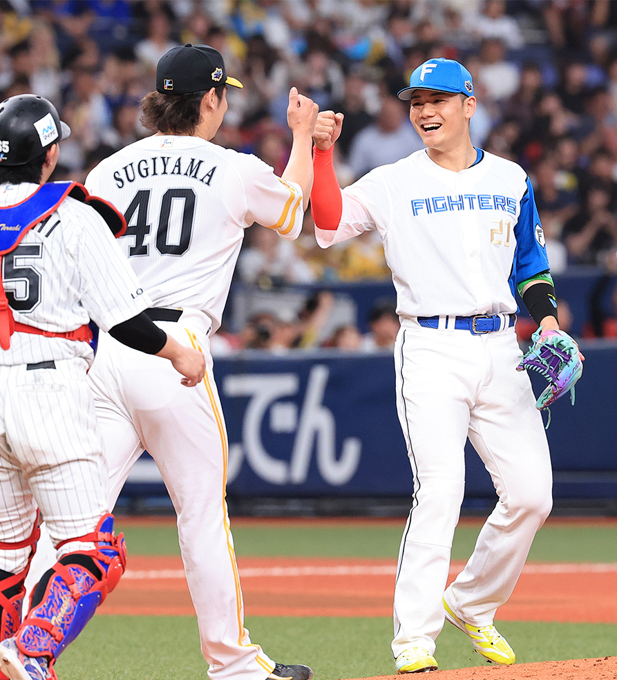 試合を締めくくった全パの杉山(中央)とグータッチする清宮