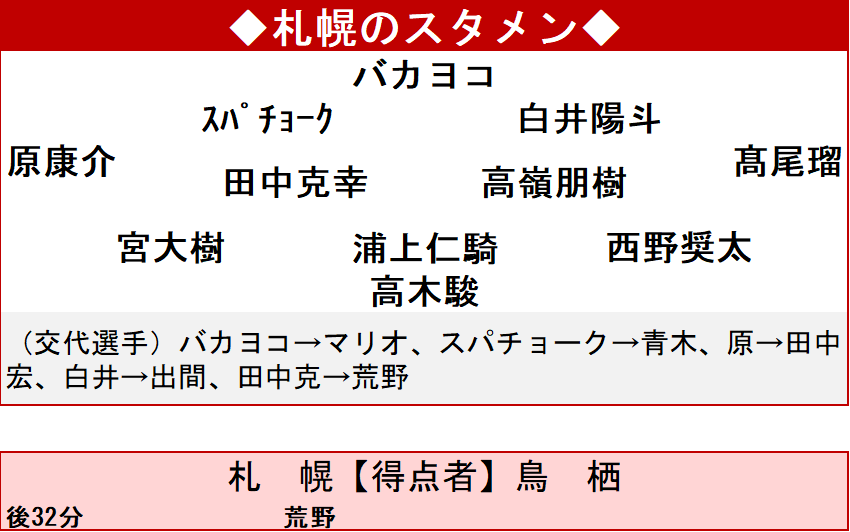 守備に細心の注意を払いながらも、ダブルボランチのMF田中克幸(23)が縦横無尽に動き回り、チャンスメークした。この日放ったシュート数は両チームトップの3本。前半21分、右サイドのDF髙尾瑠(28)からのクロスをペナルティーエリア中央から放ったシュートはゴール上に外れたが、札幌の得点が近い予感を漂わせた。前半終了間際、札幌はMF高嶺朋樹(27)のミドルシュートなど鳥栖ゴールを何度も脅かす波状攻撃を見せ、0-0で折り返した。