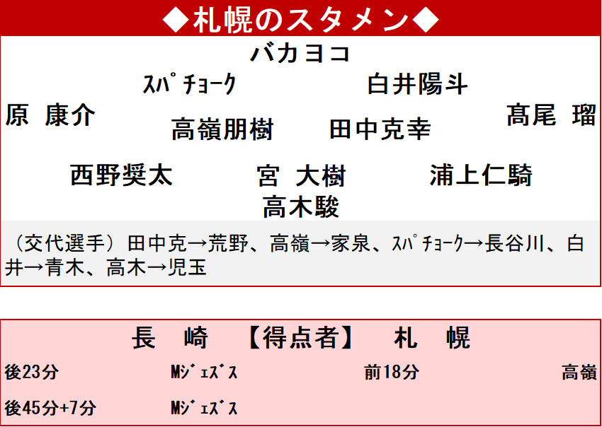 北海道コンサドーレ札幌はV・ファーレン長崎とアウェーで対戦し、1-2で敗れた。前半18分にMF高嶺朋樹(27)が4試合ぶりのゴールを放って先制に成功したが、後半23分に同点に追いつかれ、終了間際の同アディショナルタイム7分に勝ち越しゴールを許した。