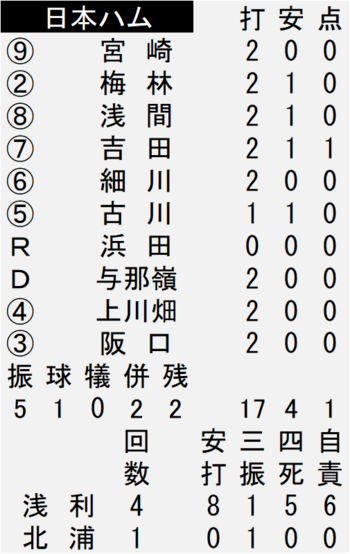 先発マウンドに上がったドラ3右腕の浅利太門投手(22)が誤算だった。先頭から連続四球でピンチを迎え、その後、2本のタイムリーと押し出し四球、内野ゴロの間に計4点を奪われた。四回には4安打を食らうなどし、さらに2点を失った。五回に2番手で登板した北浦竜次投手(25)は1回をパーフェクトに封じた。
