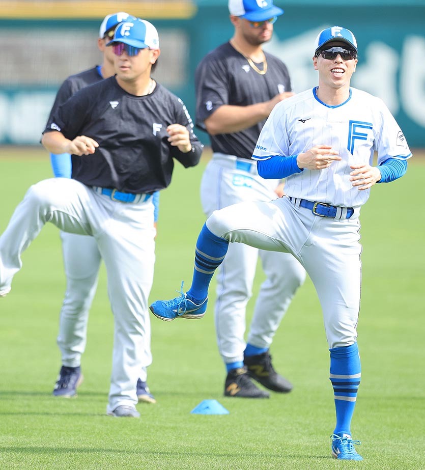 17日の楽天戦、試合前練習でリラックスした様子の五十幡(右)