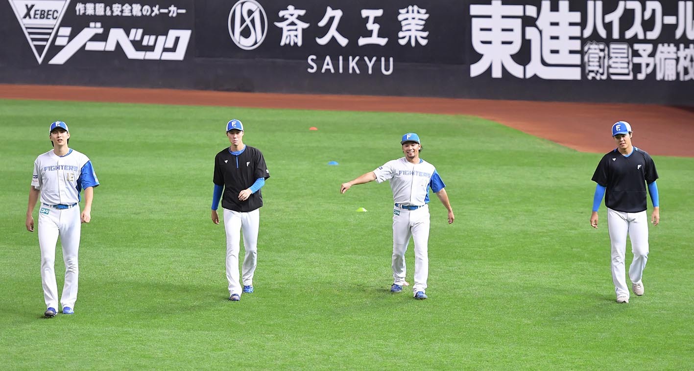 アップ中に談笑する(左から)達、福島、伊藤、柴田