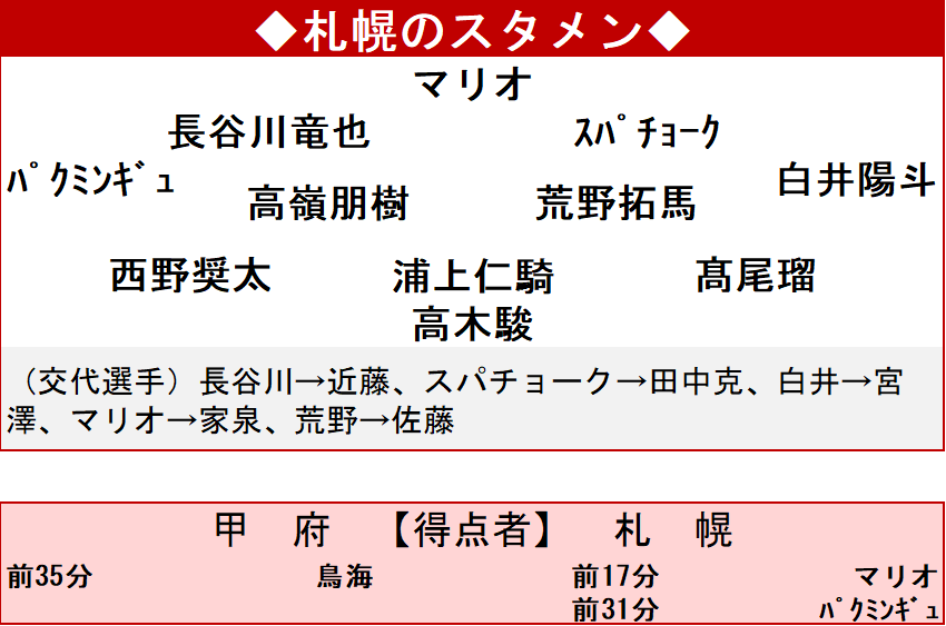 直近2試合連続でクリーンシートを達成している甲府に対し、札幌はボールを保持しながら生命線とするパスサッカーを展開した。試合が動いたのは前半17分。DF浦上仁騎(28)のロングフィードのこぼれ球をPA内で拾ったMF長谷川竜也(31)が、中央で待つFWマリオ・セルジオ(29)へラストパス。来日初先発のストライカーは左足でゴールへ押し込み、待望の先制点が生まれた。