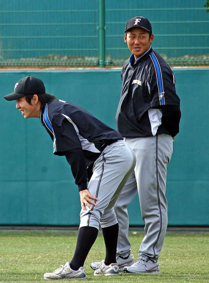 2008年の春季キャンプ、ルーキーながら最終クールまで名護組(1軍)に残った宮西(左)と中田