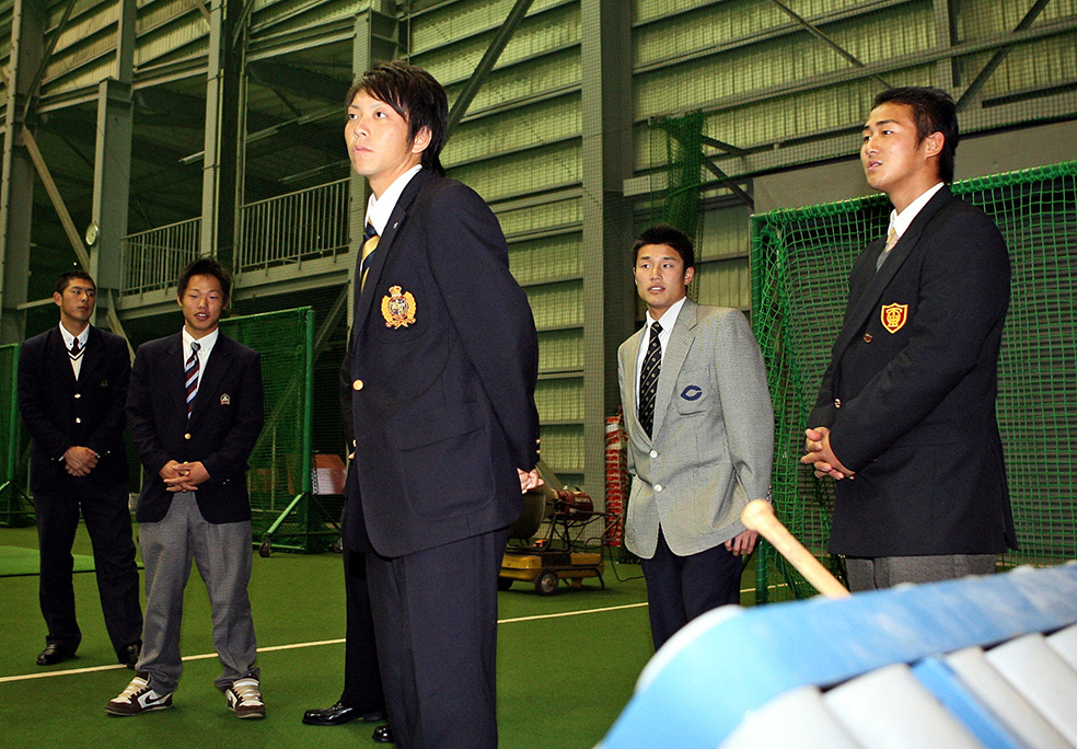 2007年12月8日、鎌ケ谷の室内練習場を見学する宮西(手前左)、中田(右)ら新人選手