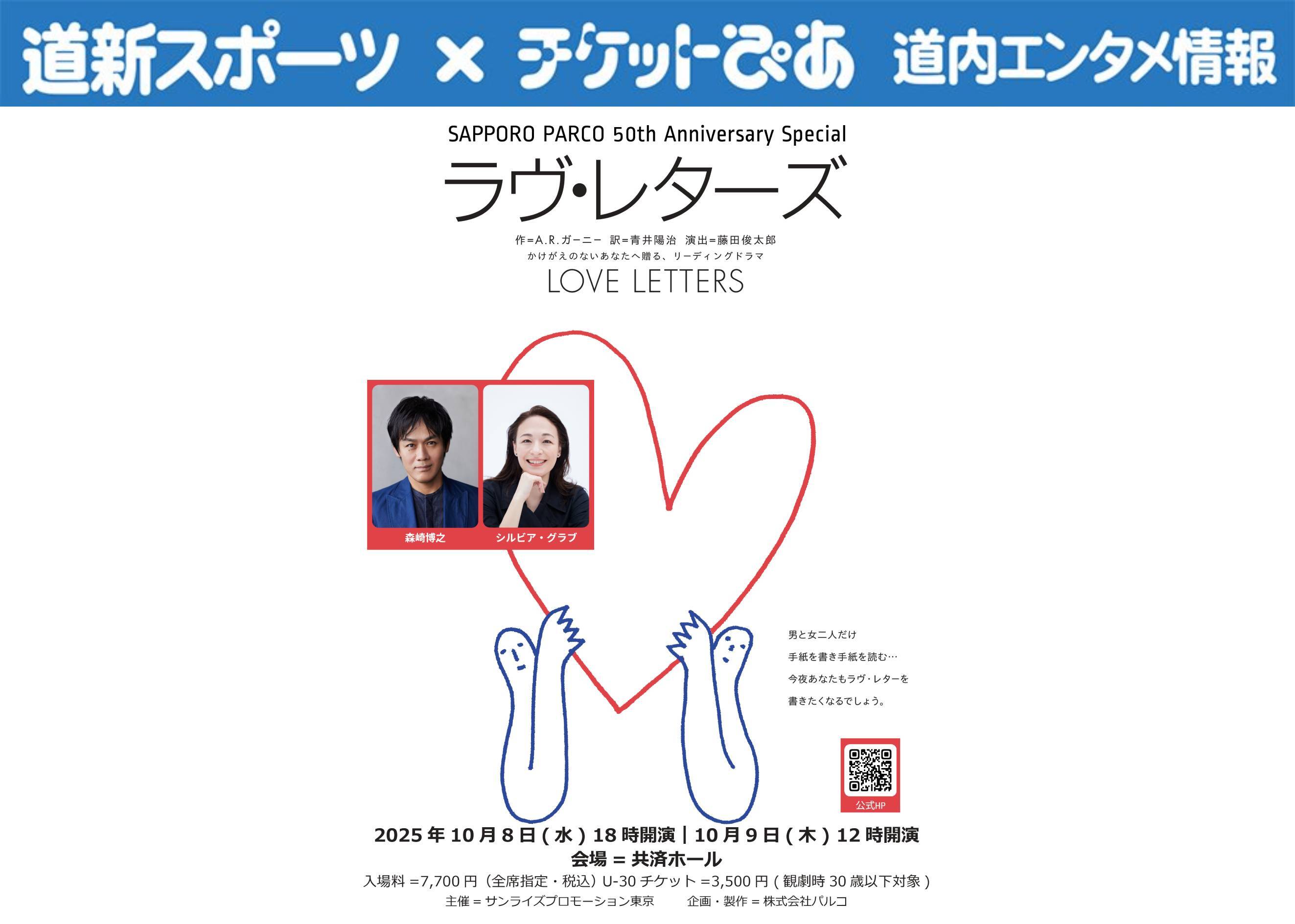 今回の「道新スポーツ×チケットぴあ」のエンタメ情報は「ラヴ・レターズ」札幌PARCO開業50周年記念公演です。1990年8月19日にPARCO劇場で幕を開け、延べ528組のカップルで上演し続けてきた朗読劇の金字塔「ラヴ・レターズ」。札幌PARCO開業50周年を記念する今回は、2016年にも共演した森崎博之とシルビア・グラブのカップルです。