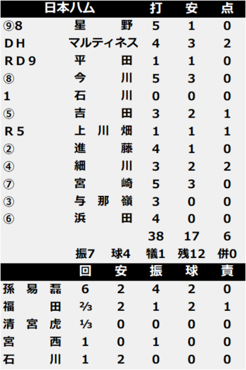 投げては先発の孫易磊投手(20)が6回2安打無失点と好投。八回に4番手で登板した宮西尚生投手(40)は1回をパーフェクトに封じた。