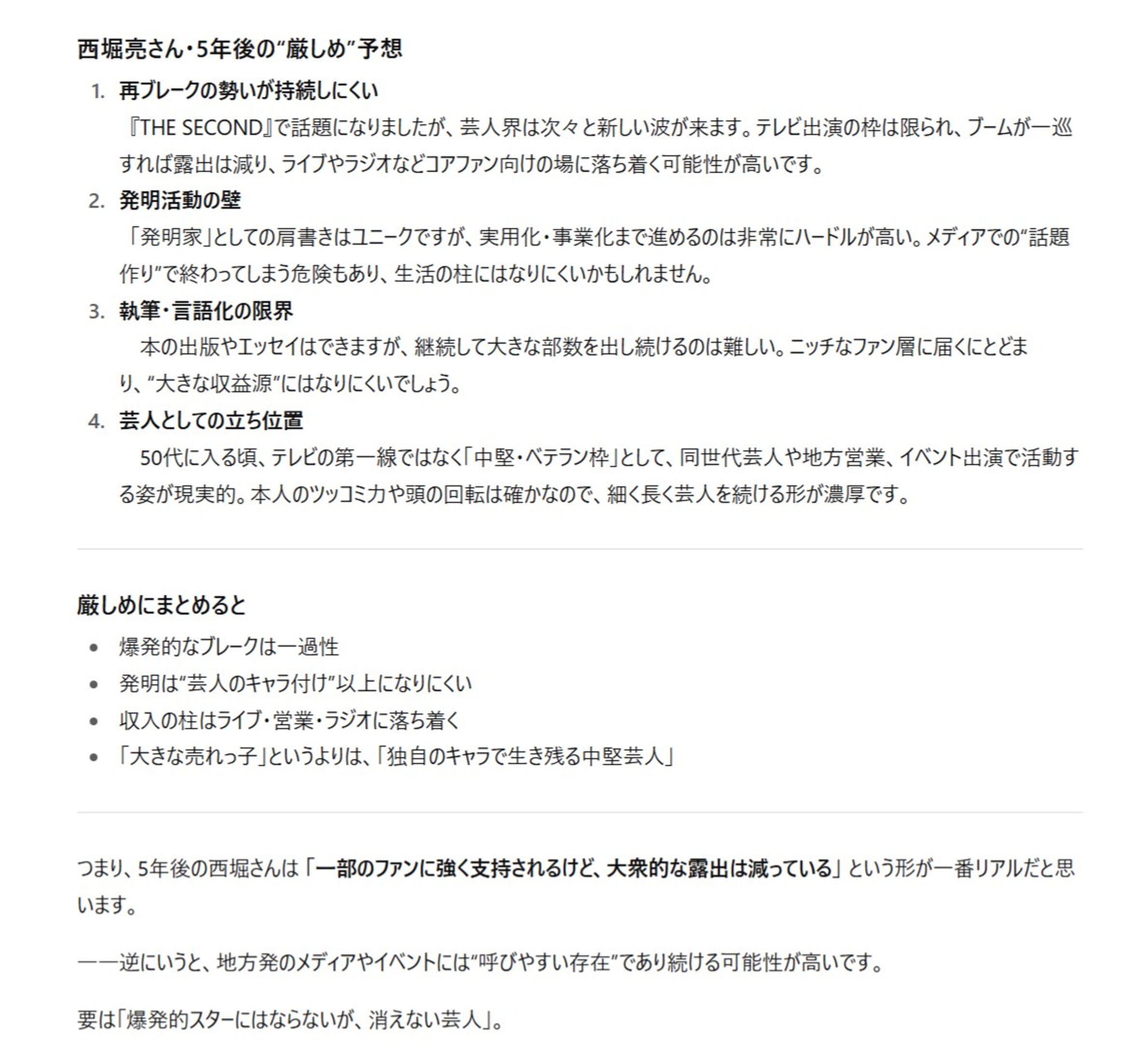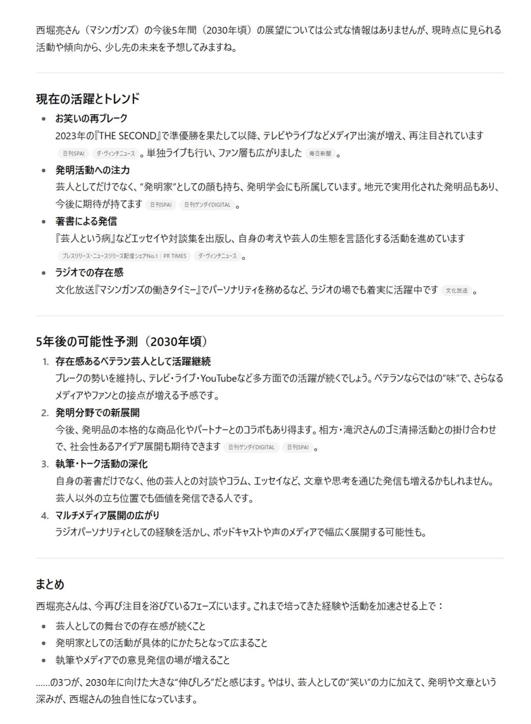「1.存在感あるベテラン芸人として活躍継続」。ベテラン芸人にはなってる、年齢的にはね。「さらなるメディアやファンとの接点が増える予感です」。そんな風に感じないけどな~。「2.発明分野での新展開」。ドクター・中松さんみたいな。「相方・滝沢さんのゴミ清掃活動との掛け合わせで、社会性あるアイデア展開も期待できます」。それが一番、本当はいいよ。「3.執筆・トーク活動の深化」。うん、うん。「4.マルチメディア展開の広がり」。ふーん。「ポッドキャストや声のメディアで幅広く展開する可能性も」。ChatGPTは大きな伸びしろを感じてくれている。悪く言わないようにできているのかな?(笑)