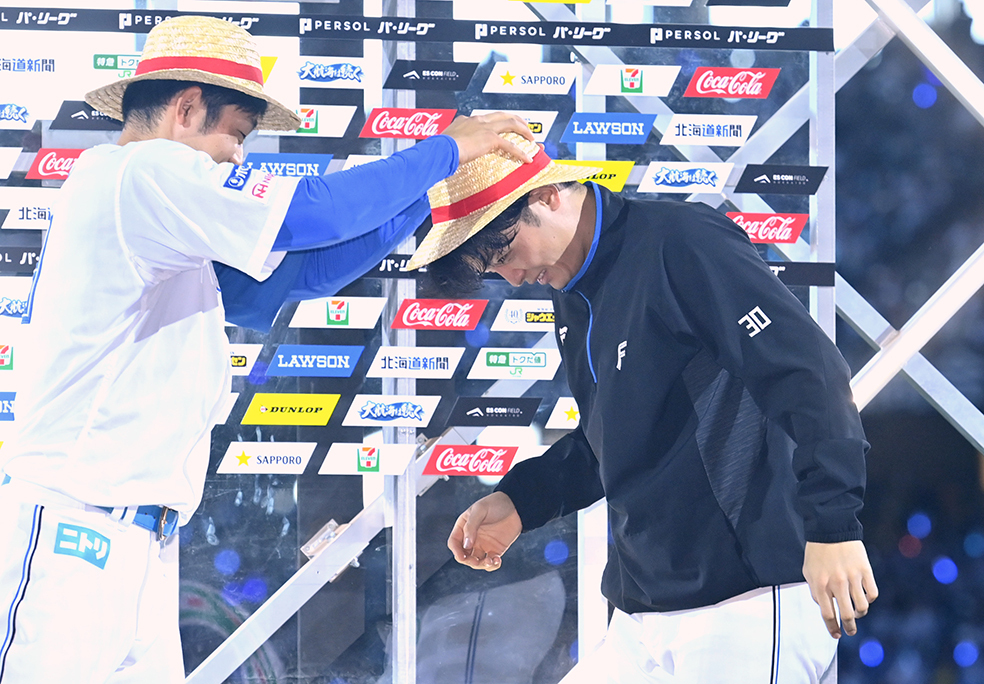 麦わら帽子を無理矢理かぶせてもらう郡司(右)