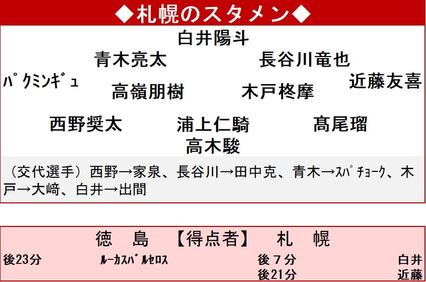 北海道コンサドーレ札幌は徳島ヴォルティスとアウェーで対戦し、2-1で勝ち点3を上積みした。順位は10位のままだが、4位から6位に落ちた徳島との勝ち点差を「5」に縮めた。