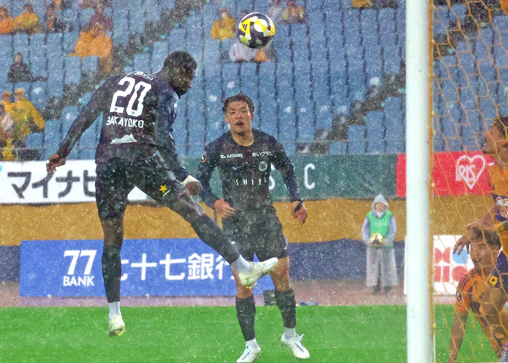5月31日、仙台戦の後半43分、同点となるヘディングシュートを決めるFWバカヨコ(左)