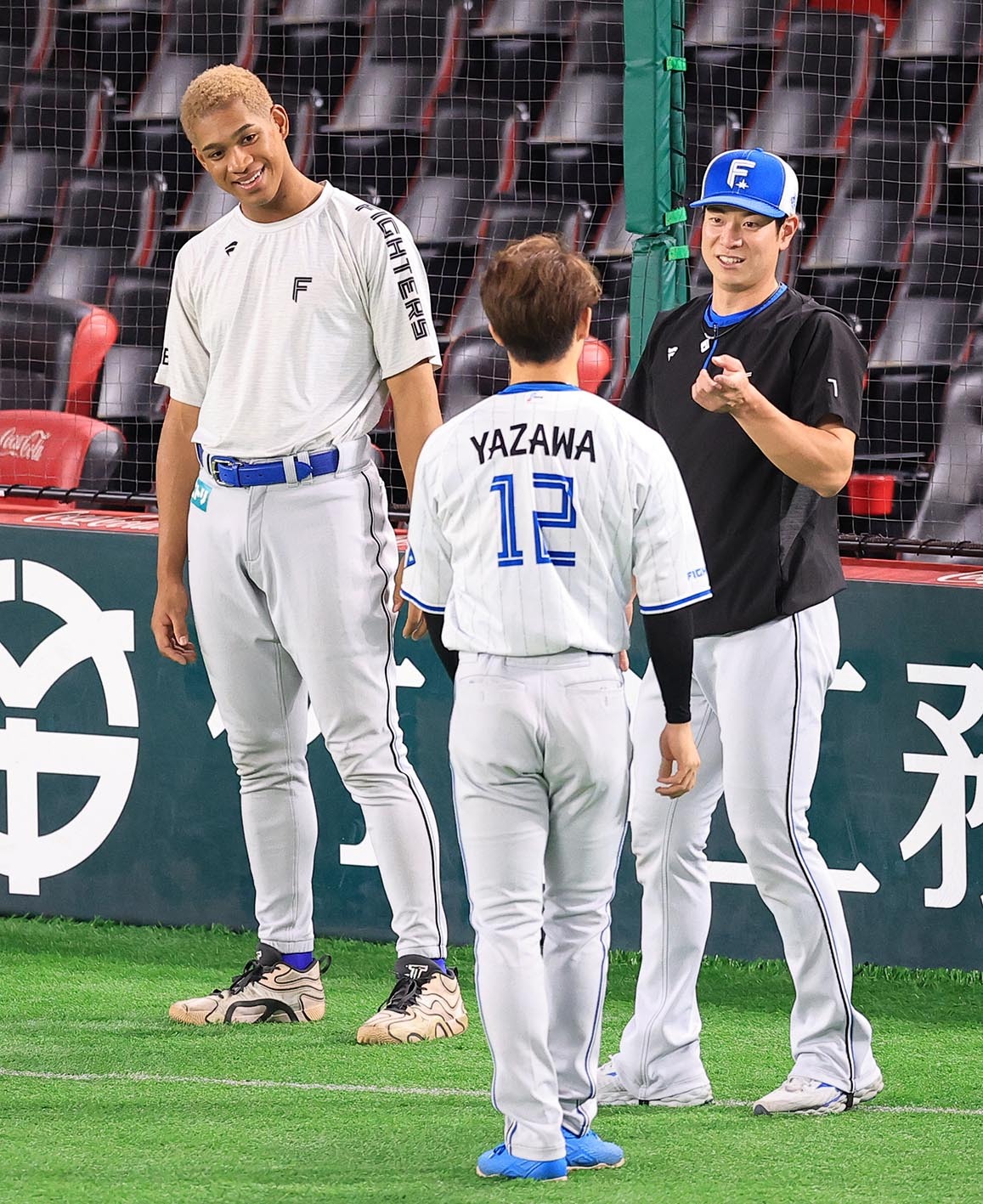 ㊧24年の秋季キャンプで森本コーチ(右)と居残り特守をした矢沢㊨開幕前には新庄監督(左)から守備のアドバイスを受ける