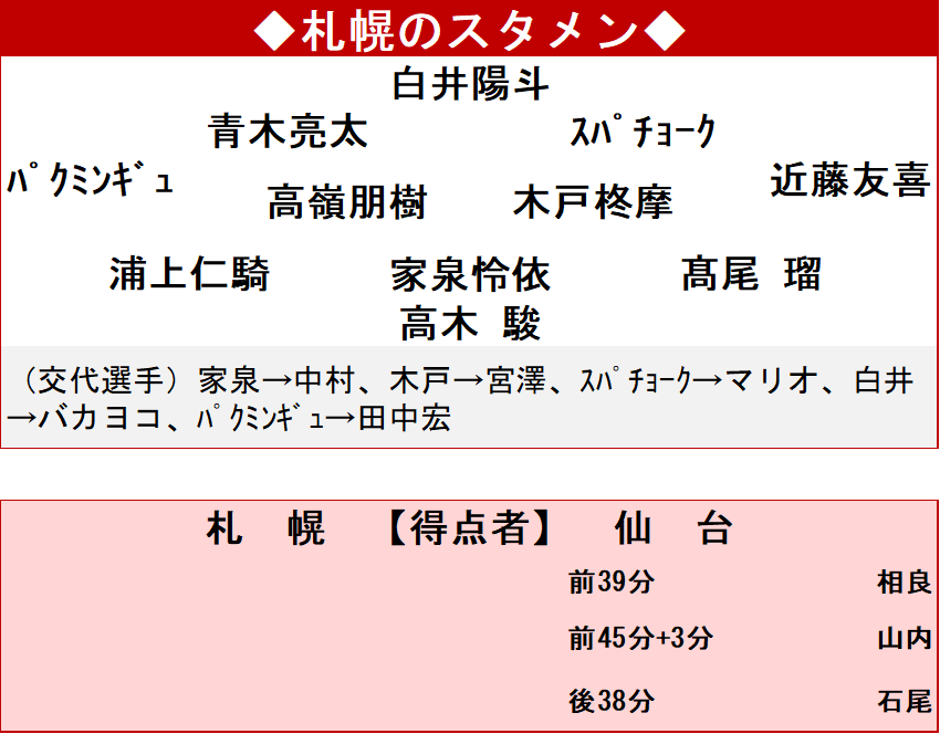 北海道コンサドーレ札幌はベガルタ仙台とホームで対戦し、0-3で敗れた。前日に今季限りでの現役引退を発表したMF深井一希(30)のためにも逆転昇格に向けて勝利が欲しかった札幌だったが、自動昇格圏の2位・長崎を勝ち点4差で追いかける4位の仙台もモチベーションが高く、勢いに押されて完敗した。