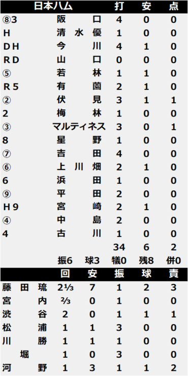 四回に3番手の渋谷純希投手(18)の暴投で5点ビハインドとなり、六回は伏見寅威捕手(35)の捕逸でさらに1点追加された。0-6で迎えた直後の攻撃、4番・伏見が無死一、二塁から適時二塁打を放ち1点返した。続く5番・一塁のアリエル・マルティネス捕手(29)の遊ゴロの間に2点目が入った。しかし反撃はここまで。九回のマウンドに上がった河野竜生投手(27)が1死満塁のピンチを招き、2点二塁打を打たれて万事休した。