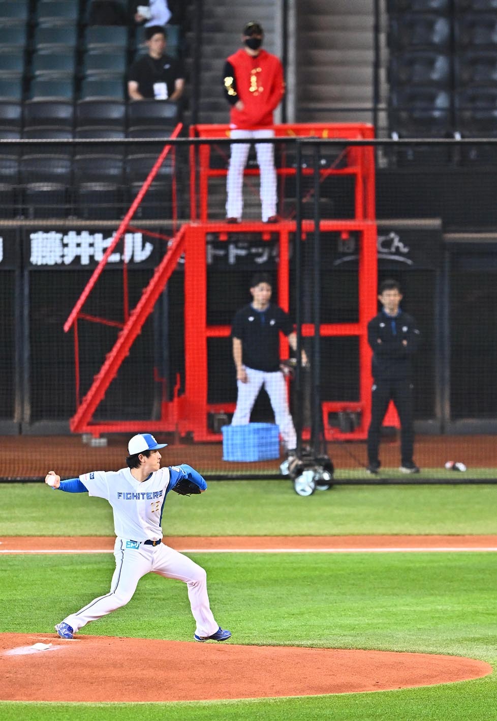 ビッグボスステージから新庄監督(中央上)が見守る中、ライブBPに登板した北山