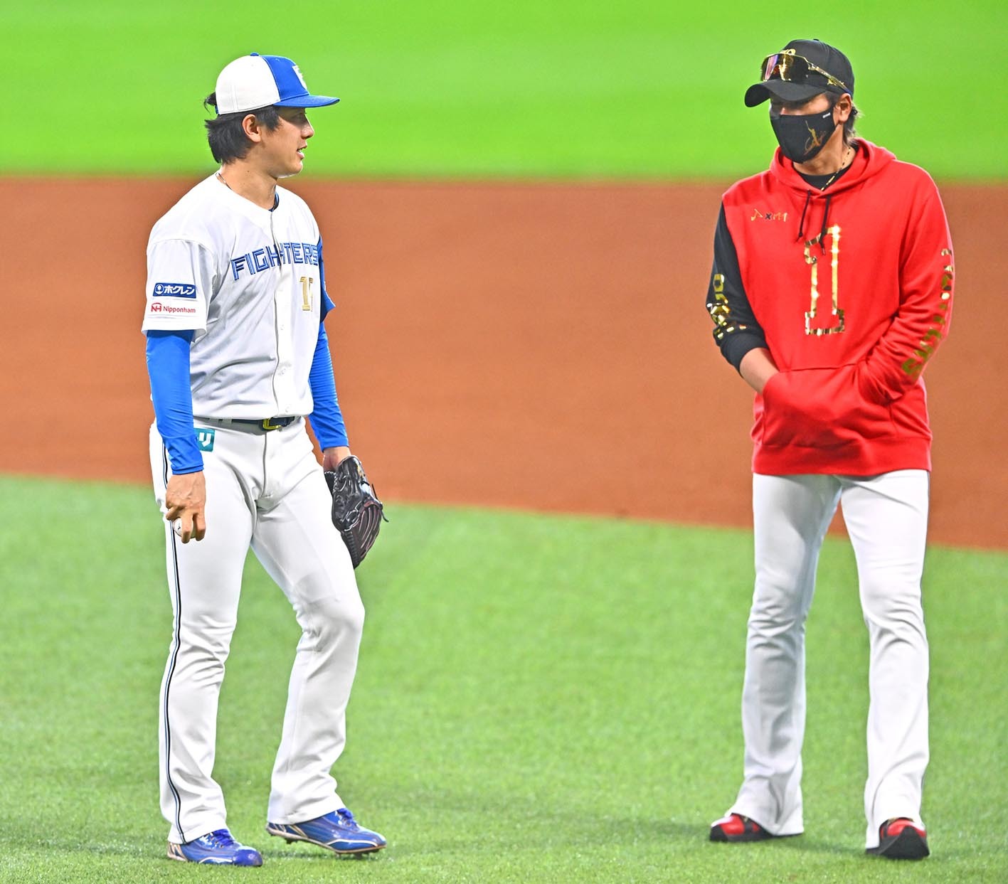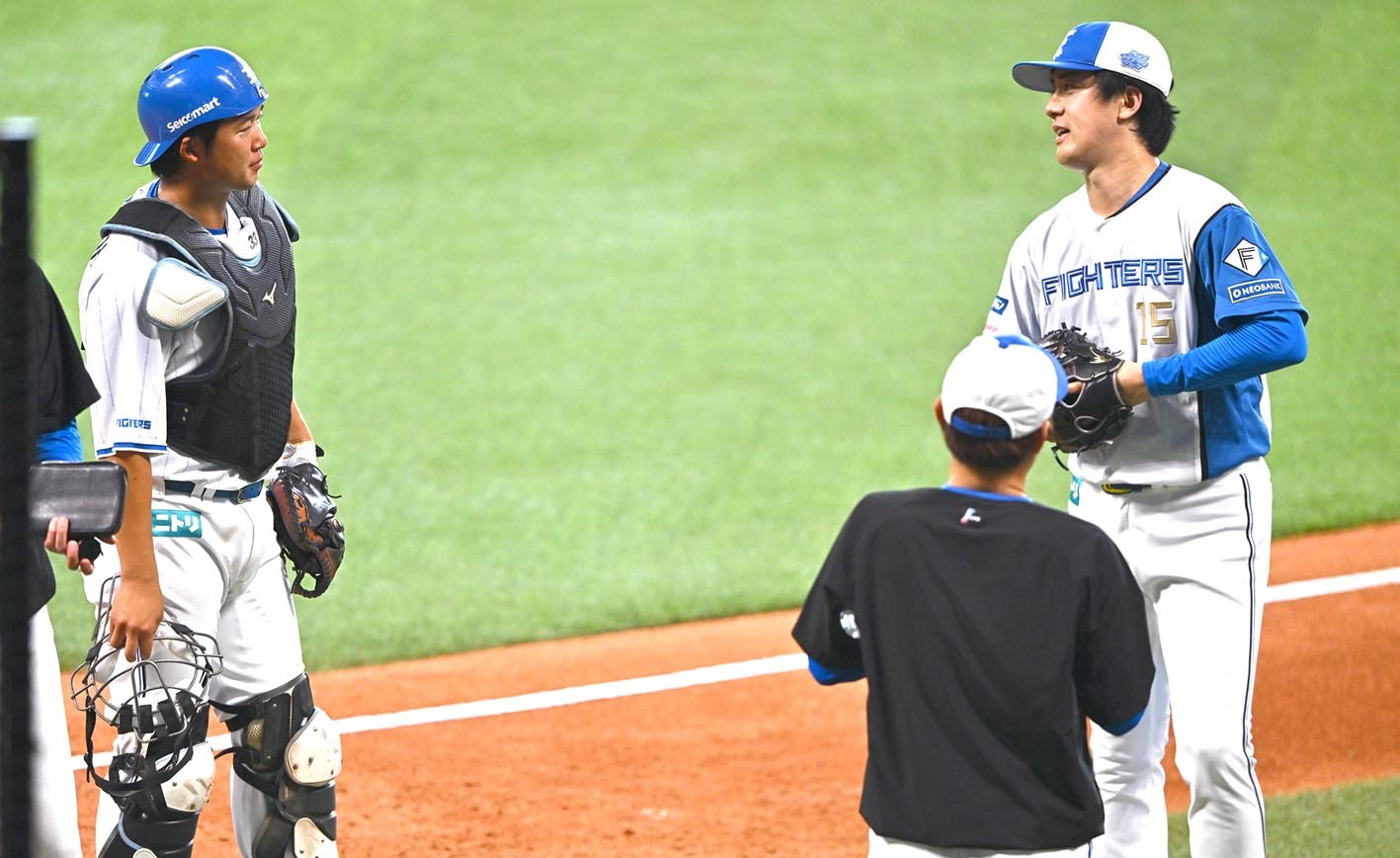 ライブBP登板前に新庄監督(右)と会話をかわした北山
