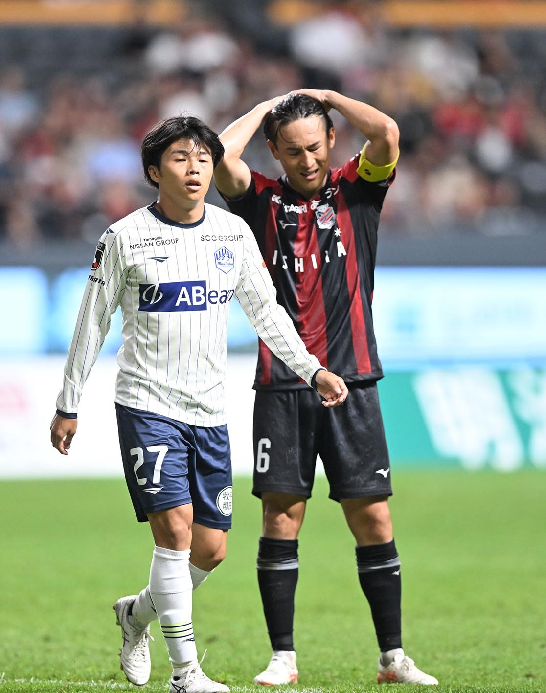 欲しかった勝ち点3に届かなかったMF高嶺主将(右)。試合後は決定力不足を嘆いた=撮影・小田岳史