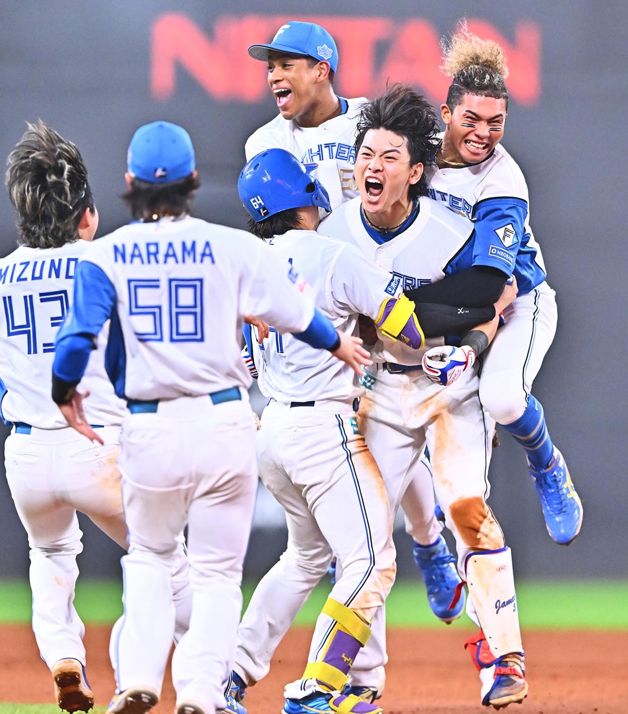 8月19日のオリックス戦、九回2死満塁、逆転のサヨナラ打を放ち、ームメートと喜ぶ野村(中央)