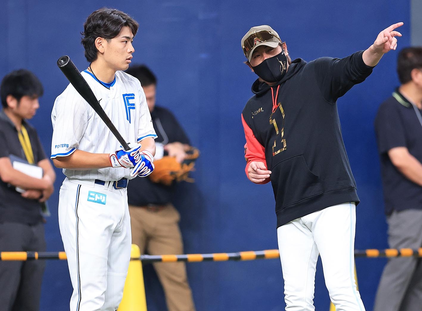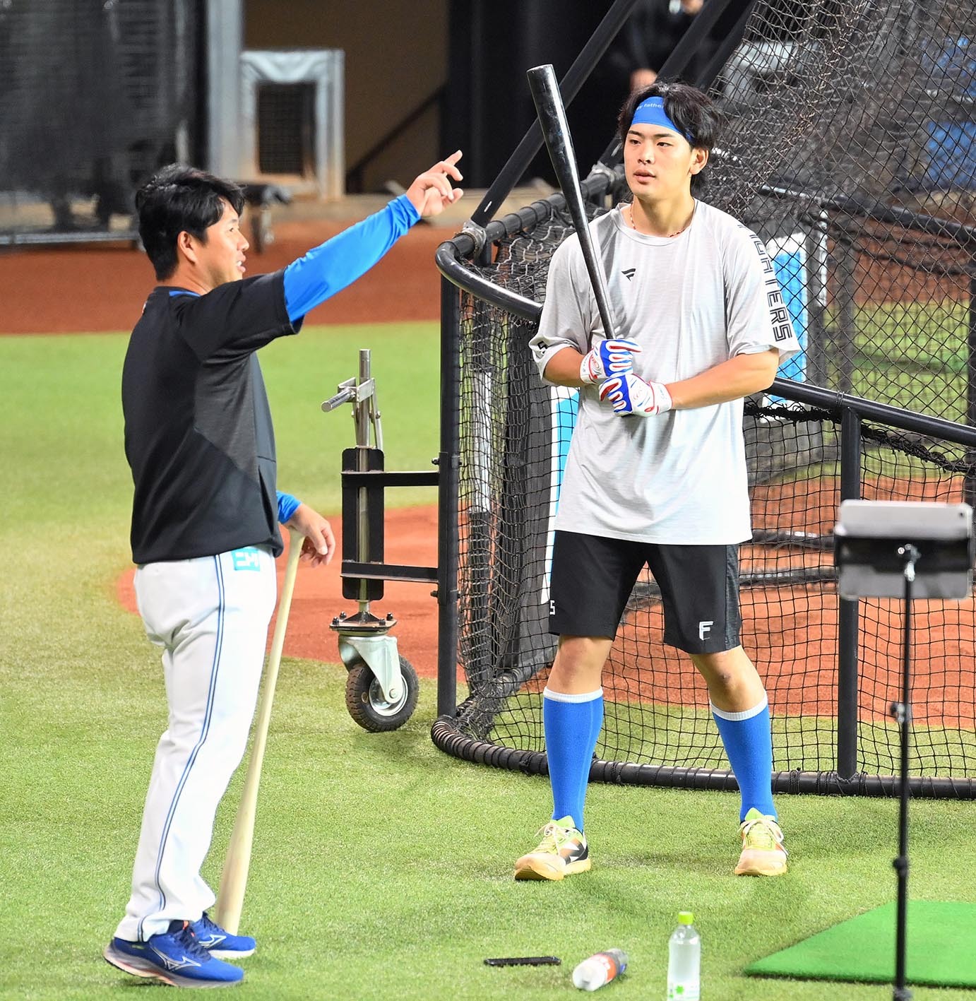 8月2日のオリックス戦、試合前練習で話し込む野村(左)と新庄監督