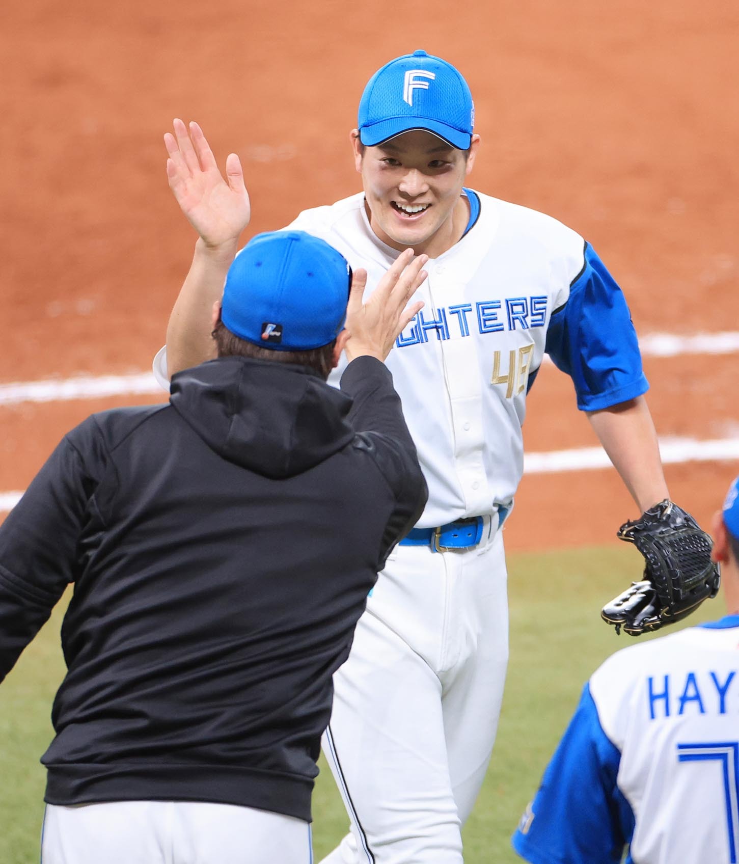 試合終了後、新庄監督(左)とハイタッチを交わす斎藤