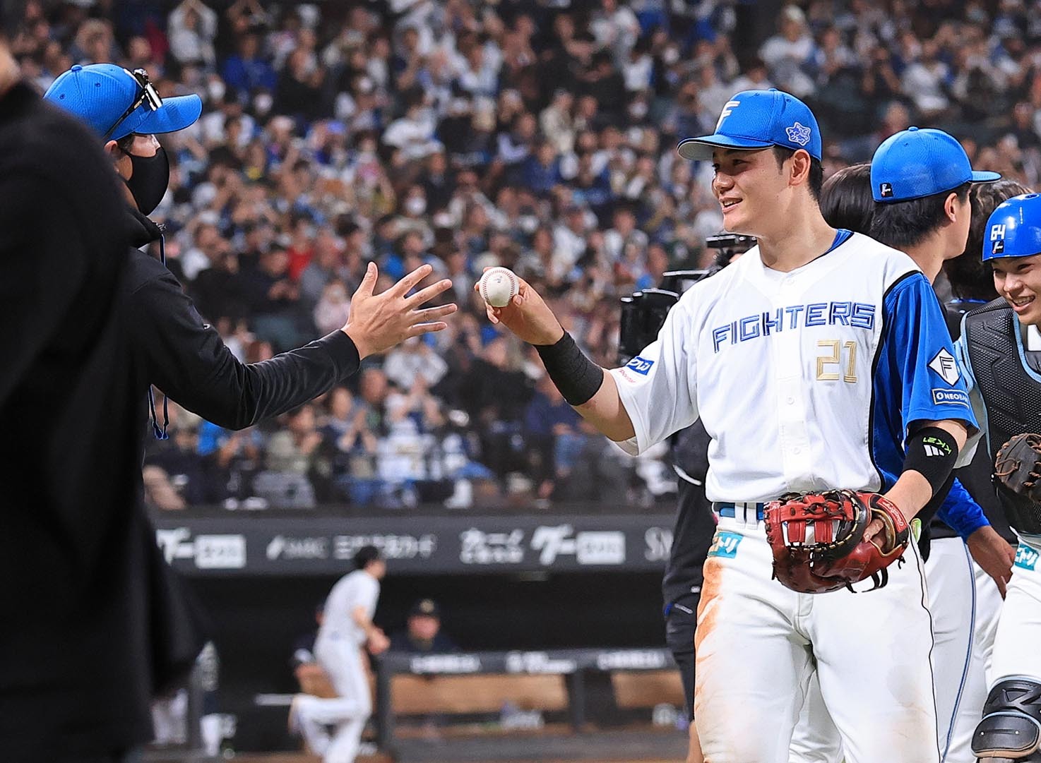 試合後、ウイニングボールを新庄監督(左)に手渡す清宮幸