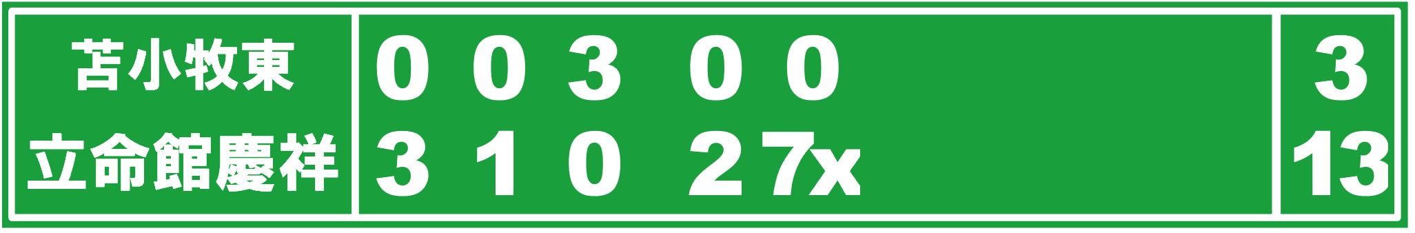 立命館打線は、相手投手の不安定な立ち上がりを見極め、攻撃した。一回、2四球などで2死一、三塁の好機をつくると、5番・小松悠人一塁手(2年)が左前に先制の適時打。さらに暴投と四球で2死満塁とし、7番・福原侑佑捕手(2年)の打席では浅い左飛を相手の左翼手が落下点を見誤る失策により2点を追加した。二回にも2番・柿澤成那左翼手(2年)が中前適時打を放ち、リードを4点に広げた。